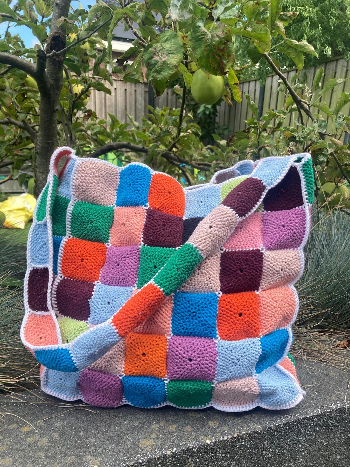 Deze leuke granny square tas is binnenkort ook verkrijgbaar in andere kleurcombinaties. De voorraad van dit haakpakket wordt niet bijgevuld.