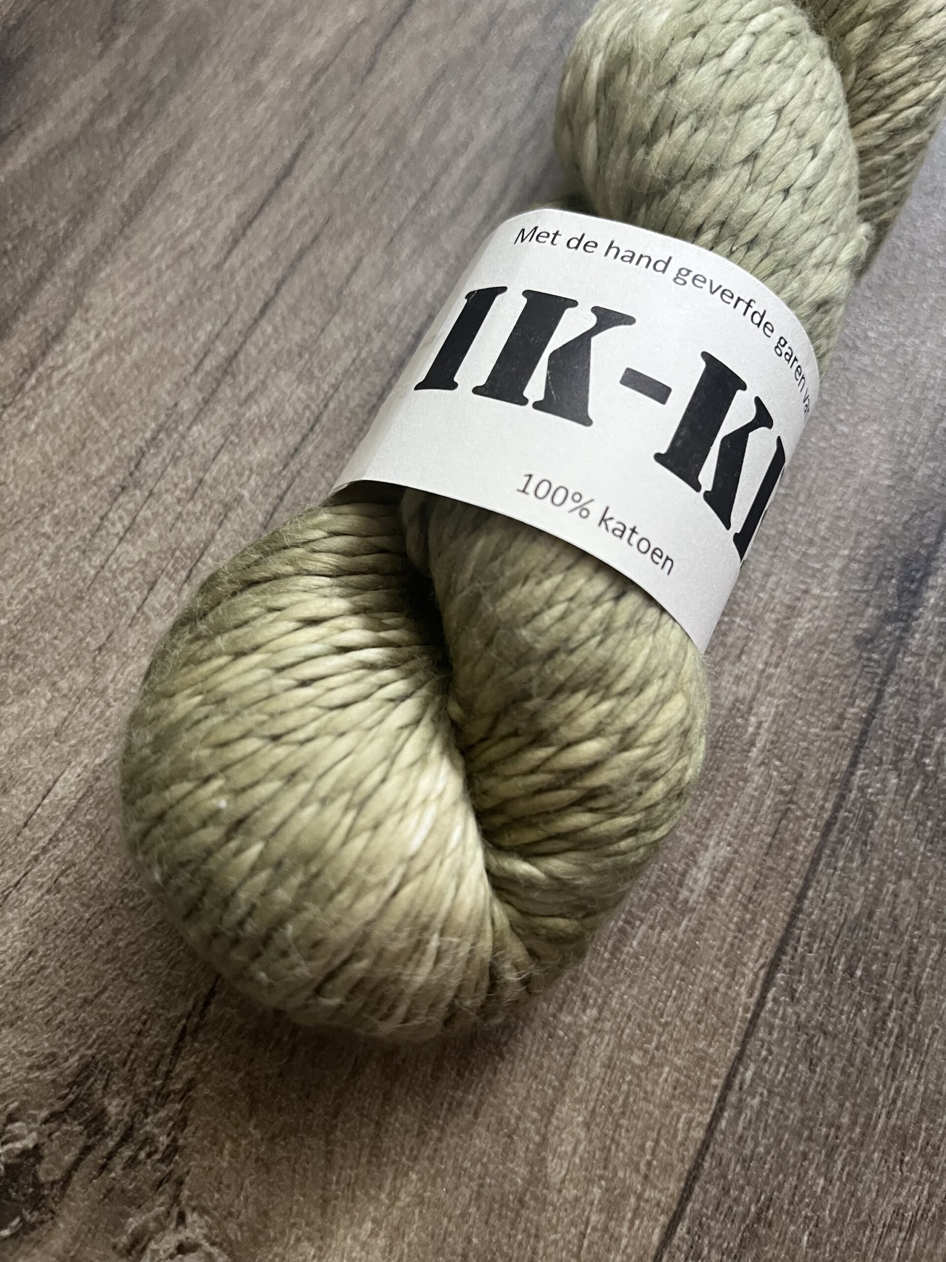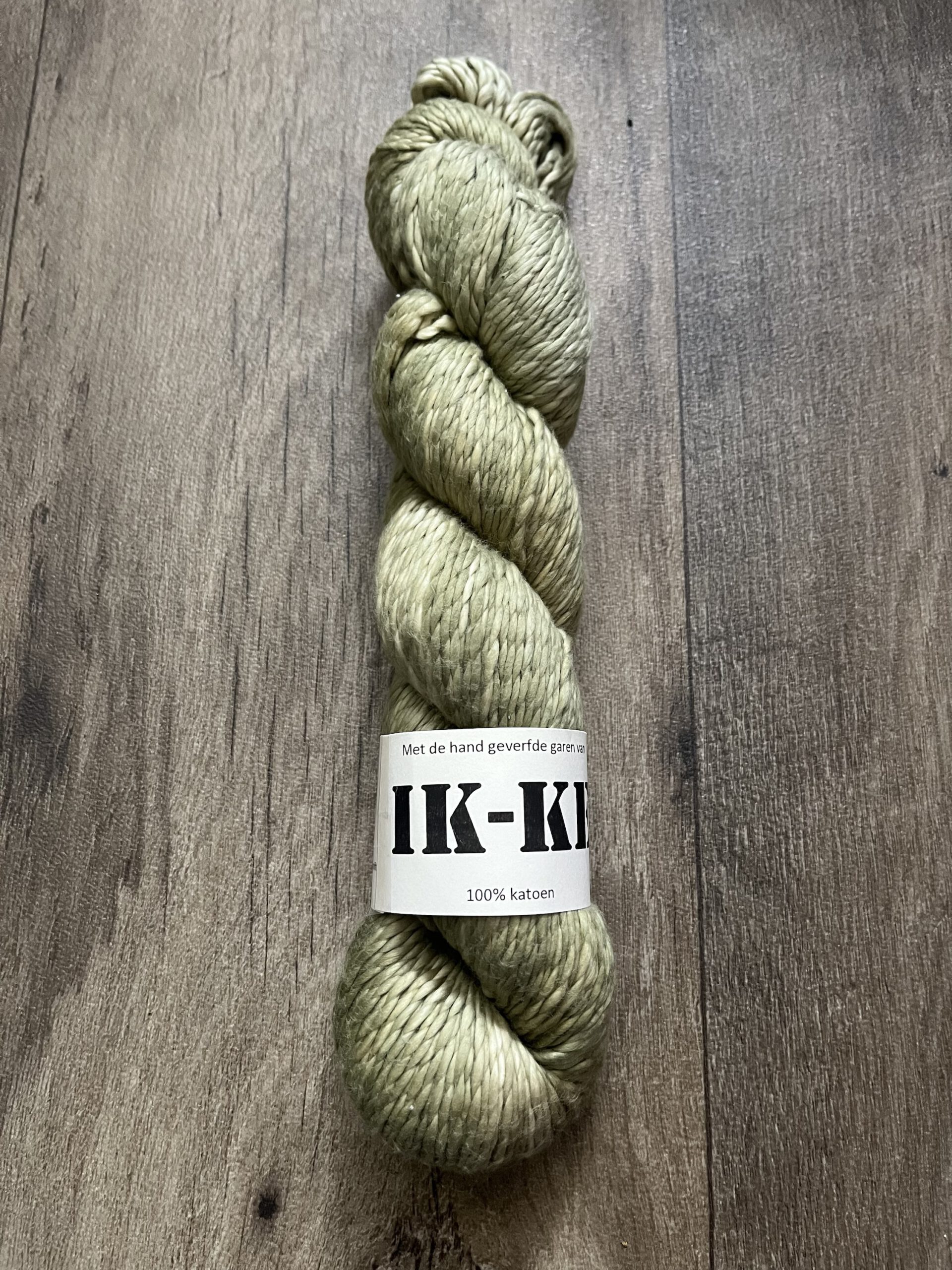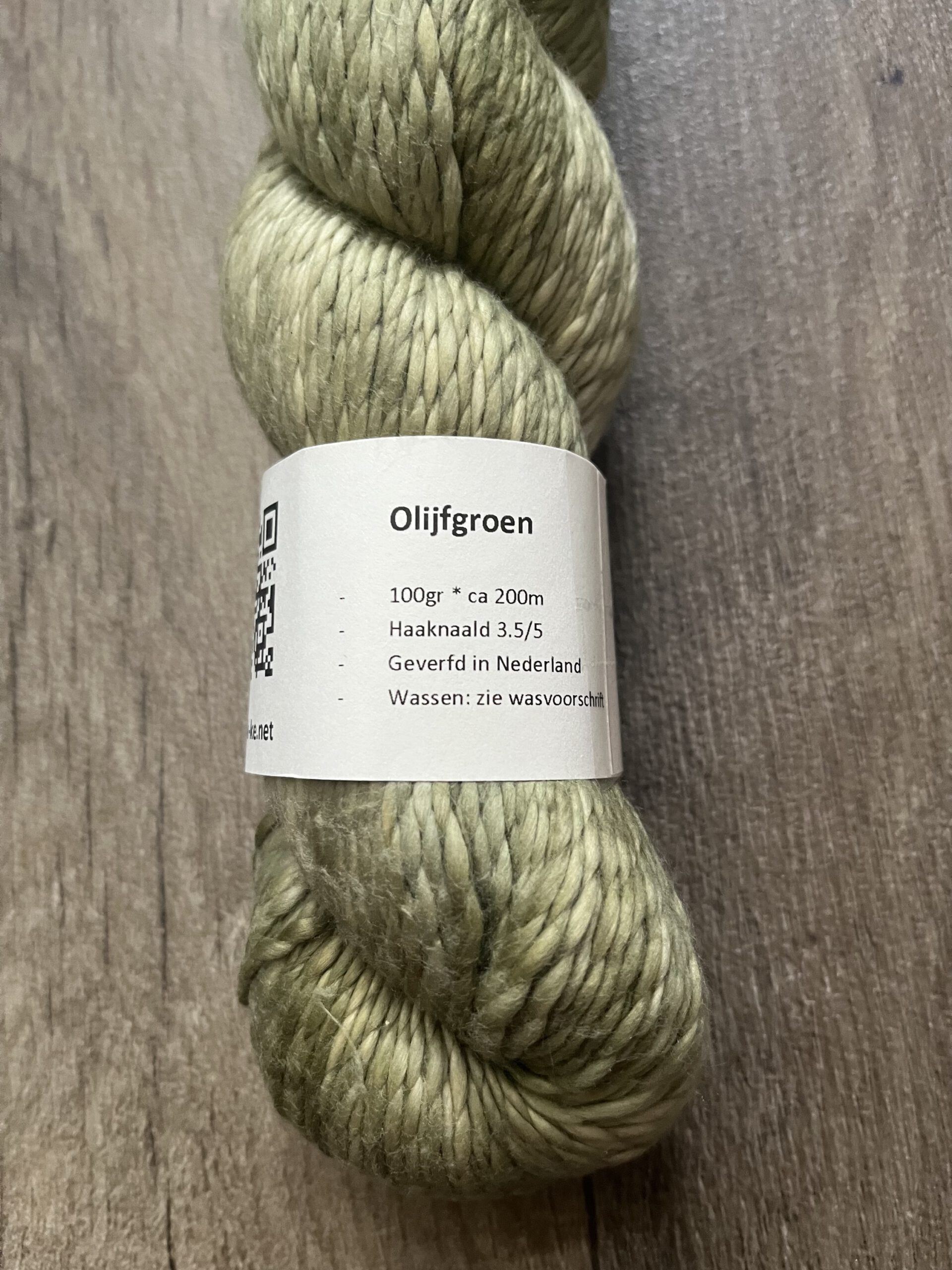 Handgeverfde 100% katoenen garen in de kleur Olijfgroen.
