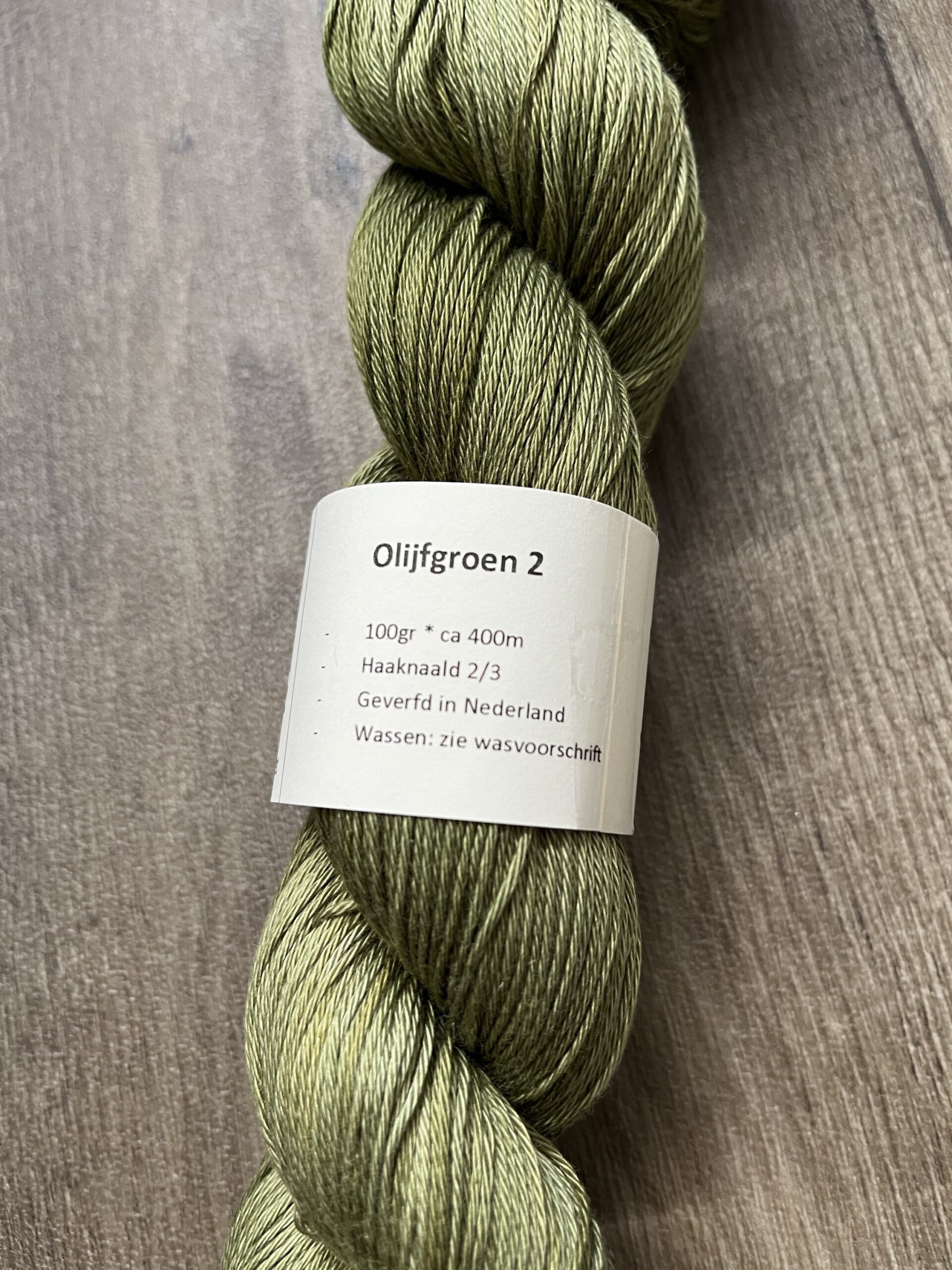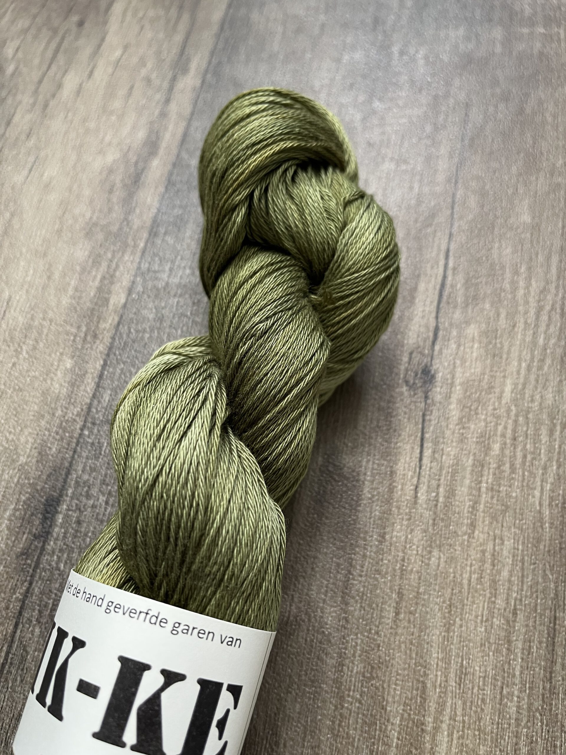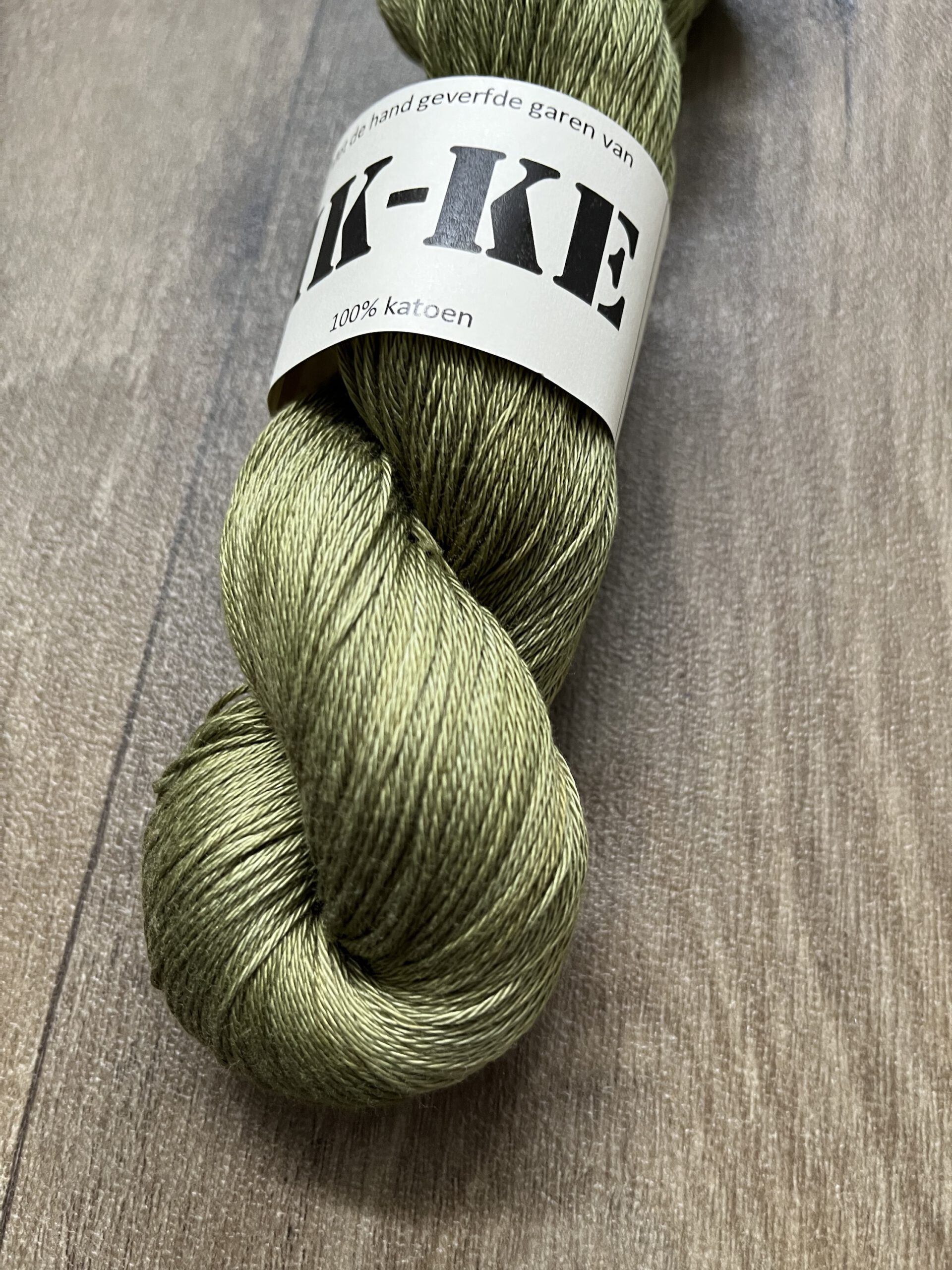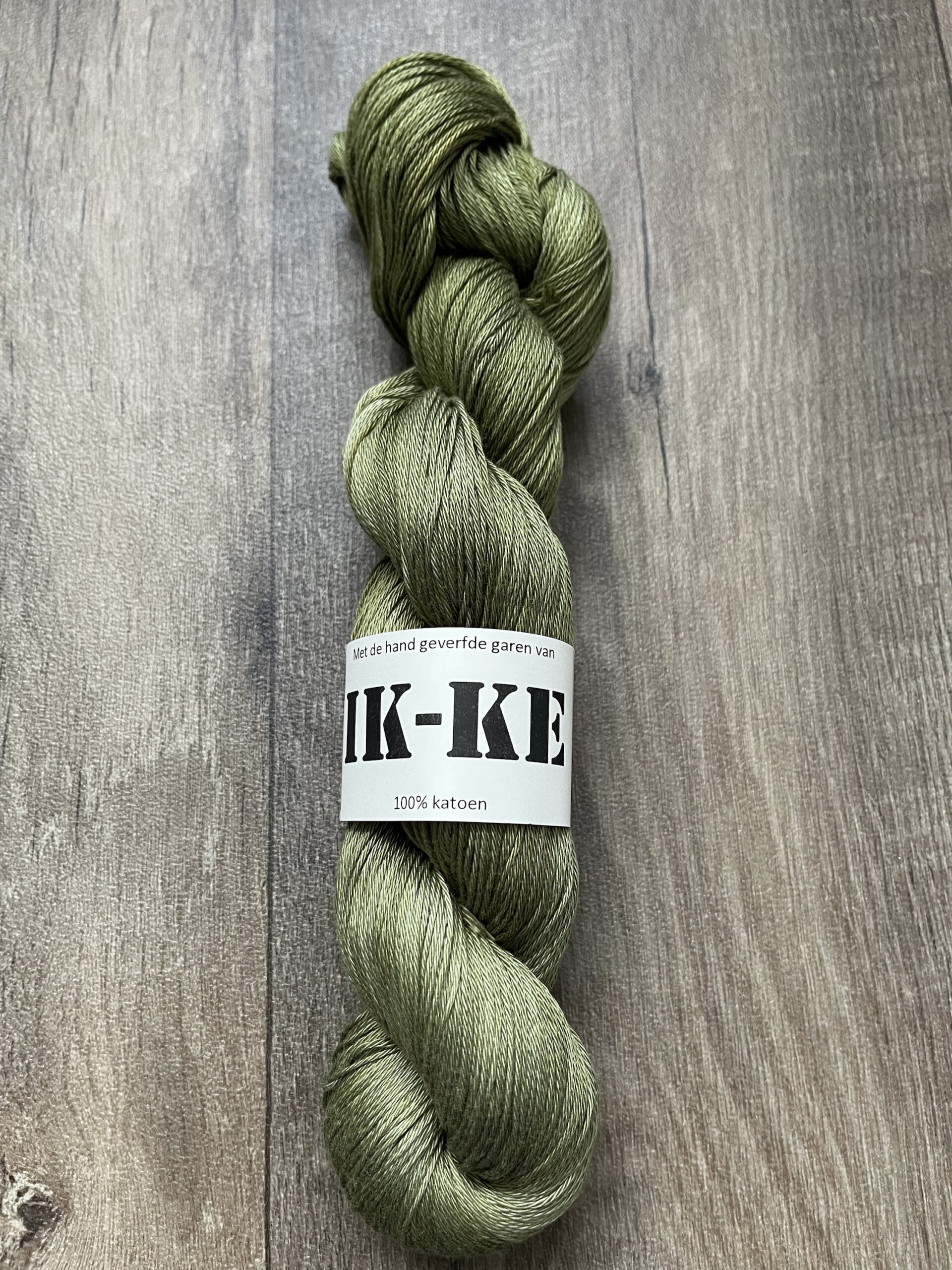 Handgeverfde 100% katoenen garen in de kleur Olijfgroen.