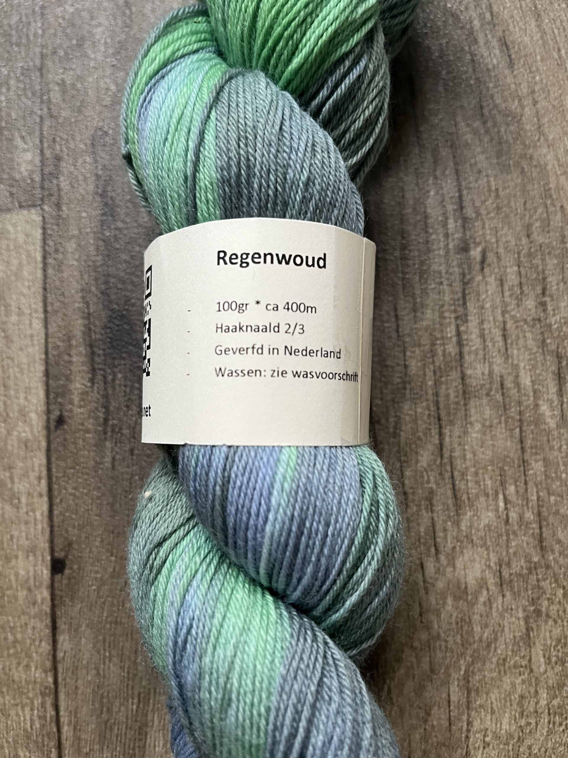 Handgeverfde wollen garen in de kleur Regenwoud.